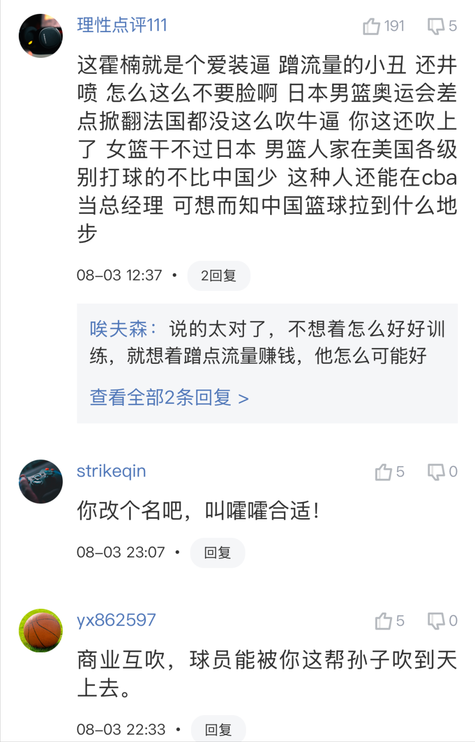 这霍楠就是个爱装*蹭流量的小丑 还井喷,怎么这么不要脸啊。日本男篮奥运会差点掀翻法国队都没这么吹牛,你这还吹上了。女篮干不过日本,男篮人家在美国各级别打球的不比中国少,这种人还能在CBA当总经理,可想而知中国篮球沦落到什么地步。